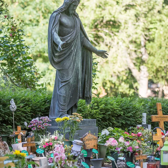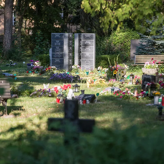 werden. Unter anderem sind das z. B. die Priesterstelen oder das Gedenk-buch für die Grabstellen, bei denen das Nutzungsrecht abgelaufen ist und nicht verlängert werden kann. Dies ermöglicht den Hinterbliebenen, trotz nicht mehr existierender Grabstätten das Andenken der Verstorbenen und die Ver-bindung zum Friedhof aufrechtzuhalten. Außerdem gibt es noch Grabstellen für Opfer von Krieg- und Gewaltherr-schaft in sogenannten Massengrabstätten.